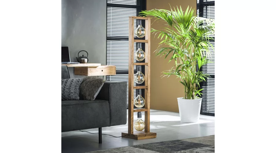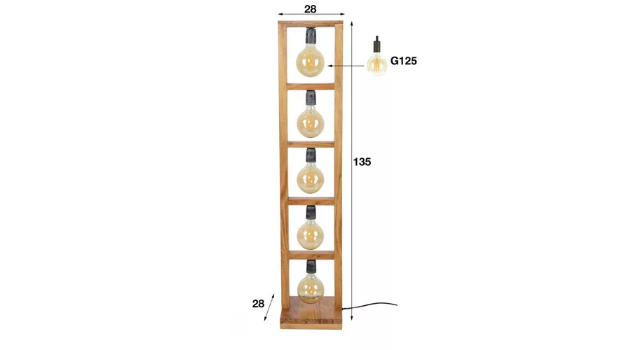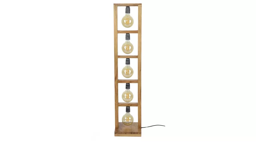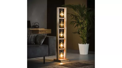 Ez a trendi állólámpa téglalap alakú vázzal és öt foglalattal rendelkezik, így a fényforrások jól láthatók és igazán érvényesülnek a dizájnban. A lámpatest akácfából készült, amely természetes és meleg megjelenést kölcsönöz. A tápkábelek diszkréten a lámpába vannak integrálva. A legjobb fényhatás érdekében LED izzó használata ajánlott. Ez az állólámpa egy sorozat része, amely egy asztali lámpát, két függesztett lámpát és egy állólámpát foglal magában.