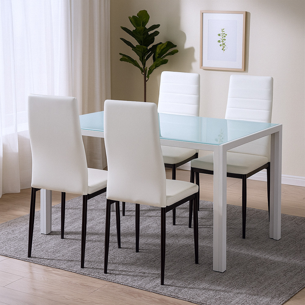 A Mabel 4+1 étkezőgarnitúra ideális választás, ha egyesítenéd a stílust, a kényelmet és a praktikumot. A letisztult vonalvezetésű asztal edzett, hőkezelt, ütésálló üveglappal és fehér, porfestett fém lábakkal készült – ez a kombináció egyszerre világosítja a teret és biztosít stabilitást a mindennapok során. Az asztal 140 × 80 cm-es méretének köszönhetően ideálisan elfér kisebb konyhákban és étkezőkben is, miközben akár 4–6 fő számára is kényelmes étkezést biztosít.
