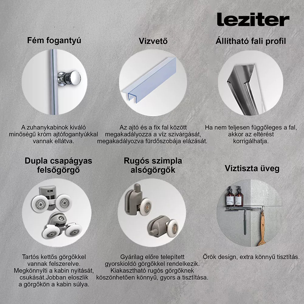 A Leziter Marco White II 80x80 zuhanykabin méretéből adódóan könnyen beilleszthető kisebb és közepes méretű fürdőszobákba is. A teljes magasságban fehér hátfal letisztult, modern megjelenést ad, miközben eltakarja a mögöttes burkolatot és csövezést, így akkor is tökéletes megoldás, ha felújítás nélkül szeretnél esztétikus, egységes megjelenést.