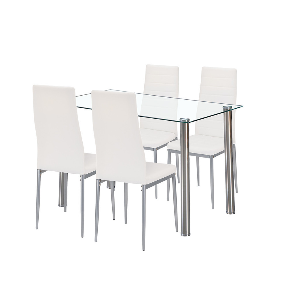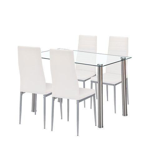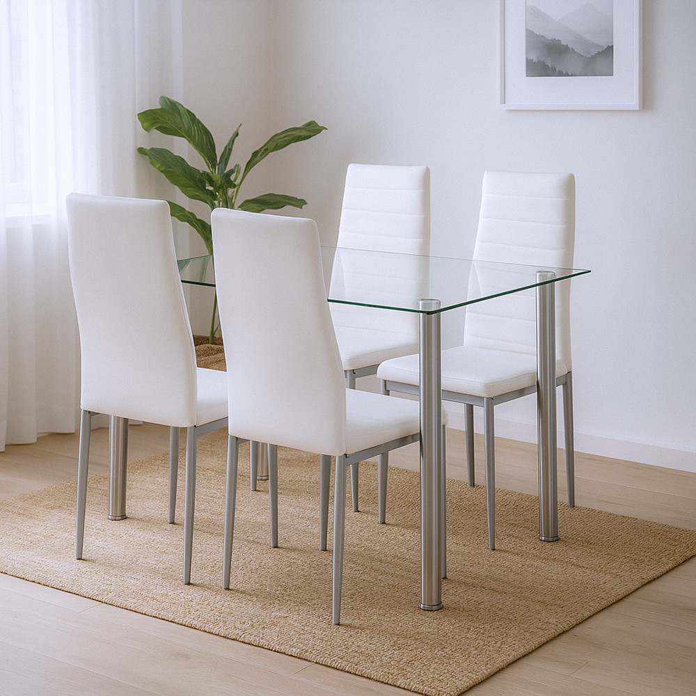 Mateo 4+1 étkezőgarnitúra – Letisztult modernség fehér-szürke székekkel és edzett üvegasztallal