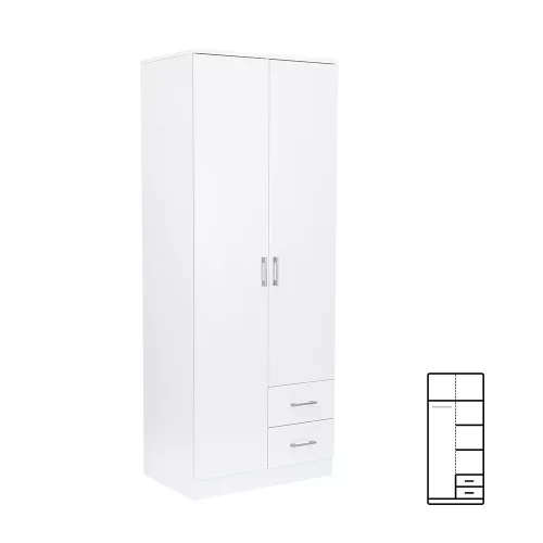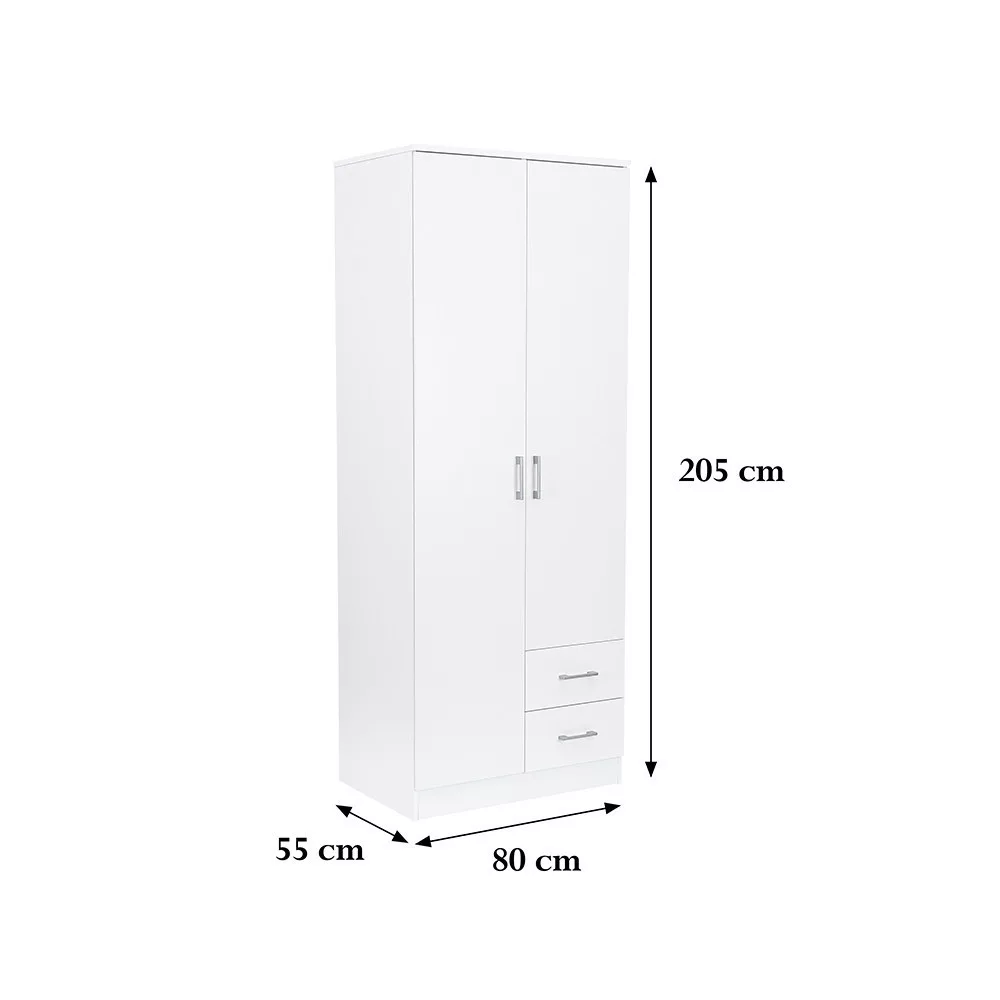 Az elegáns fehér front és a fahatású fehér korpusz ötvözete tökéletes harmóniát teremt a nappaliba vagy a hálószobába egyaránt. A 205 cm magas, 80 cm széles és 55 cm mély gardróbszekrény ideális választás mindenki számára, aki szeretné rendszerezni ruháit és kiegészítőit.