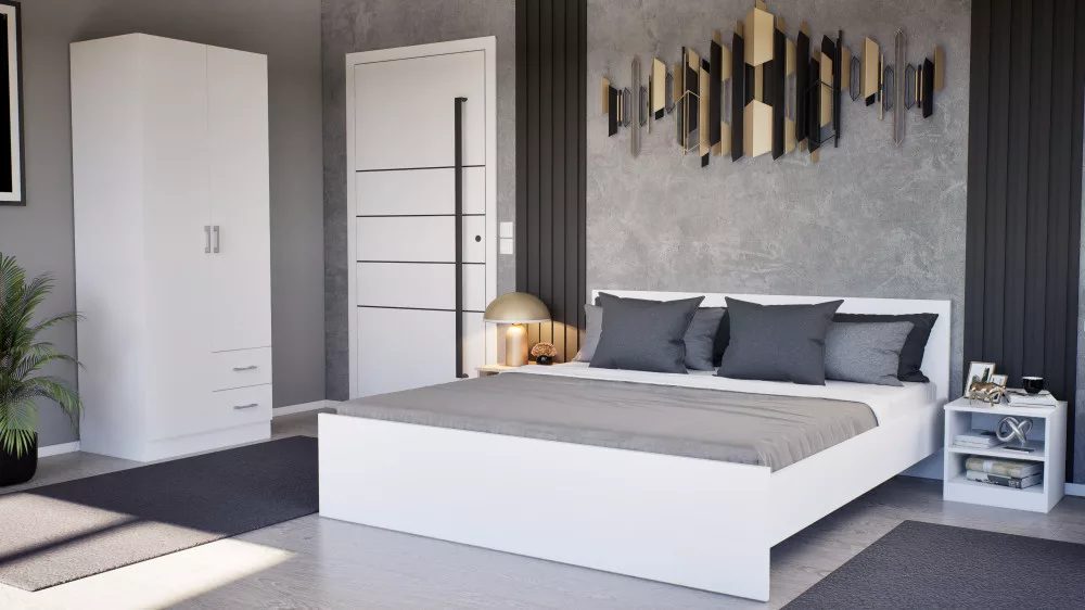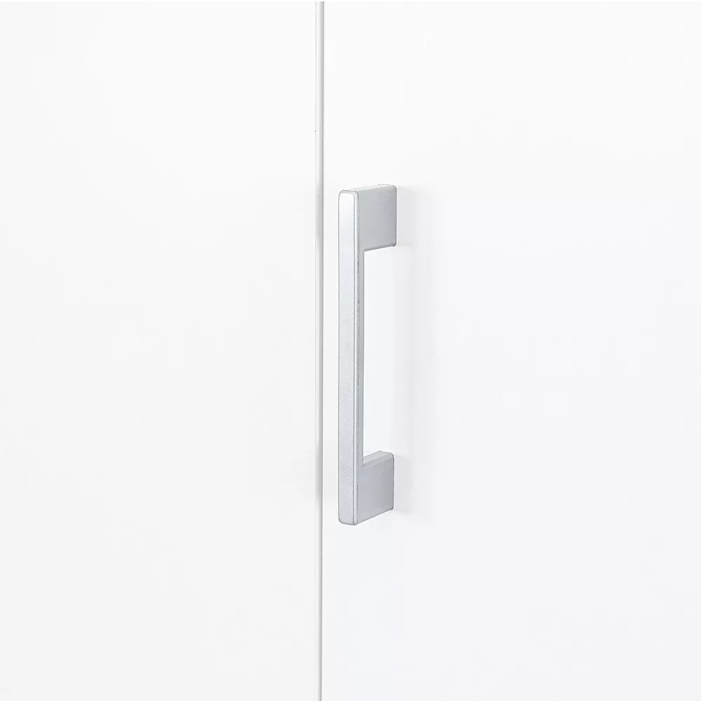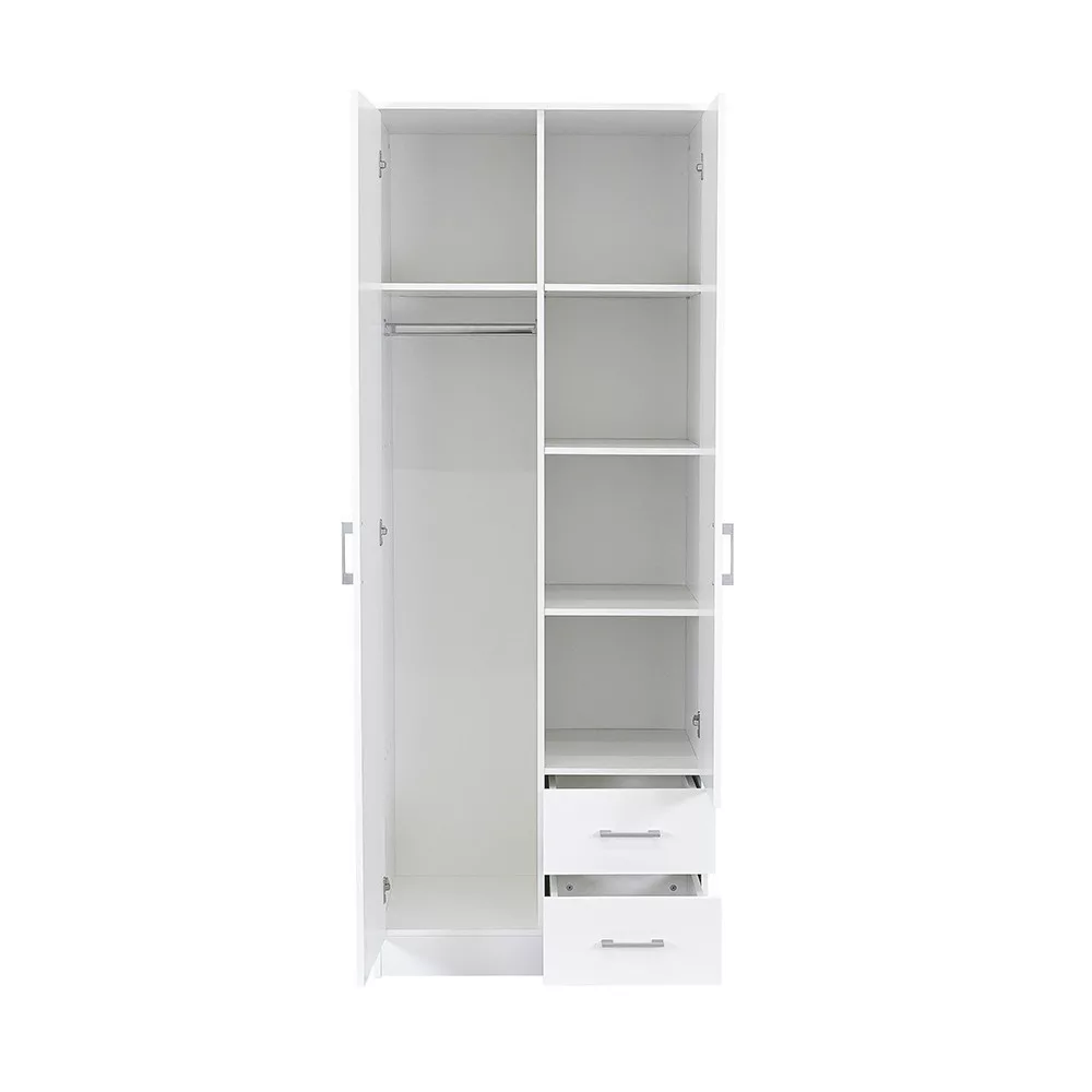 A matt króm hatású műanyag fogantyúk modern megjelenést kölcsönöznek, míg a két szárnyú nyílóajtó révén az egész szekrény belseje könnyen áttekinthető, így minden ruhadarab és tárgy könnyedén elérhető. Az öt polc és a két görgős fiók bőséges tárolóhelyet biztosít legyen szó ágyneműről, szezonon kívüli ruházatról vagy fehérneműkről.