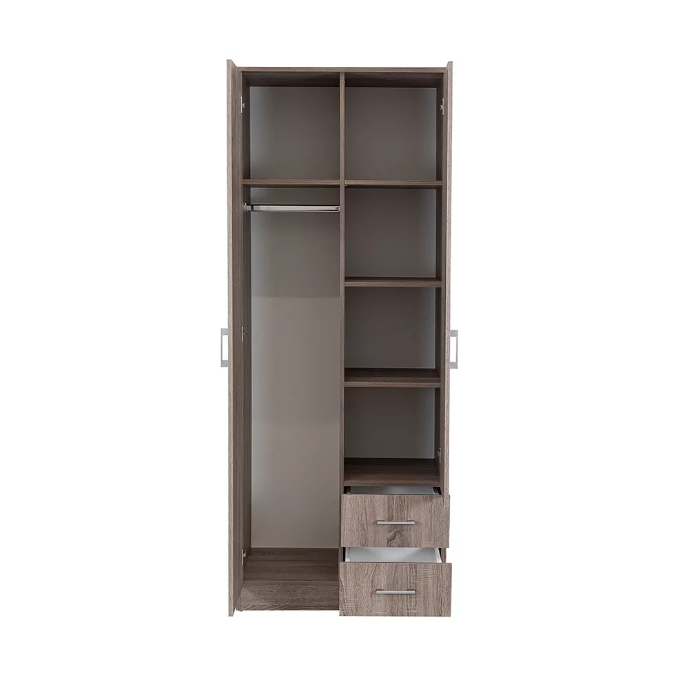 A matt króm hatású műanyag fogantyúk modern megjelenést kölcsönöznek, míg a két szárnyú nyílóajtó révén az egész szekrény belseje könnyen áttekinthető, így minden ruhadarab és tárgy könnyedén elérhető. Az öt polc és a két görgős fiók bőséges tárolóhelyet biztosít legyen szó ágyneműről, szezonon kívüli ruházatról vagy fehérneműkről.
