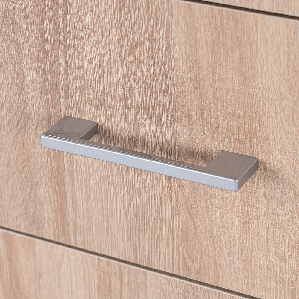 A Miami komód fehér fronttal és a sonoma tölgy korpusszal tisztaságot és eleganciát kölcsönöz a térnek, miközben a minőségi bútorlap anyaga garantálja a tartósságot és az ellenálló képességet. Méretei - 40 cm mélység, 80 cm szélesség, 92 cm magasság - ideálisak bármely helyiségbe. A komód 4 görgős fiókkal lett kialakítva, amelyek tökéletesen alkalmasak ruhák, könyvek vagy akár irodai felszerelések tárolására. A modern dizájnt matt króm hatású műanyag fogantyúk egészítik ki, amelyek még letisztultabbá teszik a megjelenést.