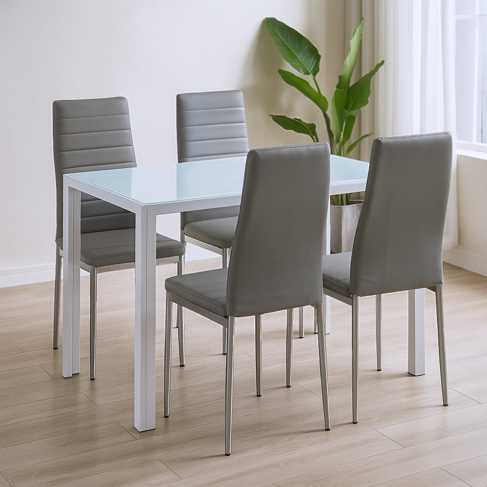 A Midland garnitúra modern, szürke-szürke szék és fehér üvegasztal színkombinációja szinte bármilyen enteriőrbe könnyedén illeszthető. A kompakt méretnek köszönhetően kisebb étkezőkben is elfér.
