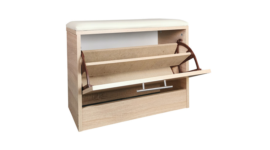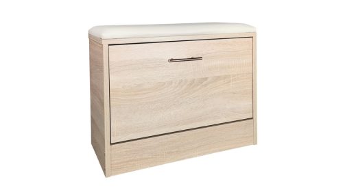 A termék MDF váza stabilitást garantál, míg a PU kárpitozás kényelmes ülőfelületet kínál. A fehér tölgy szín elegáns megjelenést kölcsönöz az előszobának vagy bármely más helyiségnek. A króm fogantyú finom dizájnelemként szolgál, amely könnyű kezelhetőséget tesz lehetővé.