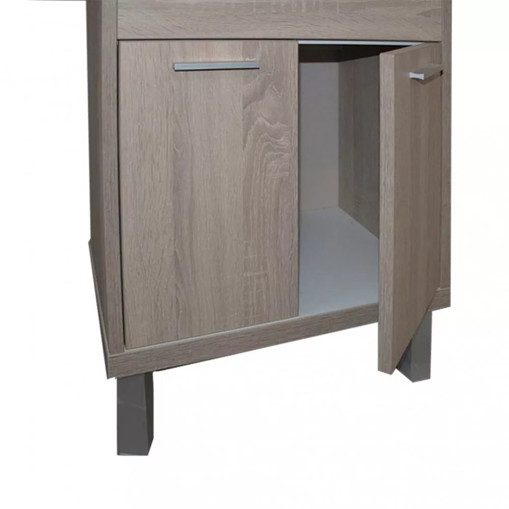 A fürdőszoba bútor kevés helyet foglal viszont tágas szekrénnyel rendelkezik ahol kényelmesen elférnek a fürdőszobai pipere eszközök. Kevés helyigénye miatt kisebb fürdőszobák berendezésére is alkalmas, például panel lakásokban. A termék magas minőségű bútorlapból készül és színben passzoló élzárókkal van ellátva. A fürdőszoba bútor mosdóval együtt kapható.
