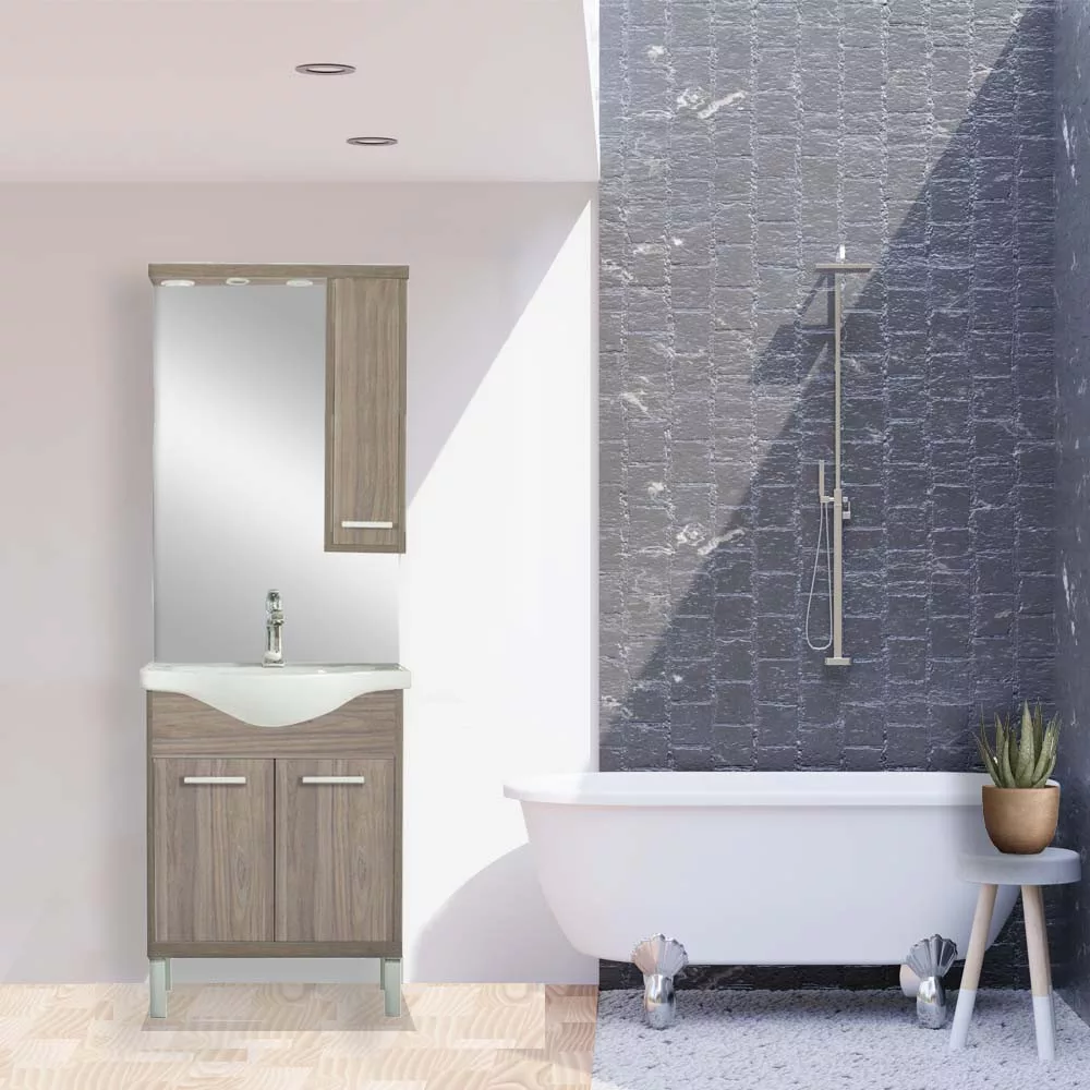 A fürdőszobabútor kevés helyet foglal viszont tágas alsó és felső szekrénnyel rendelkezik, ahol kényelmesen elférnek a fürdőszobai pipere eszközök. Kevés helyigénye miatt kisebb fürdőszobák berendezésére is alkalmas, például panel lakásokban. A termék magas minőségű bútorlapból készül és színben passzoló élzárókkal van ellátva. A fürdőszobabútor mosdóval együtt kapható.