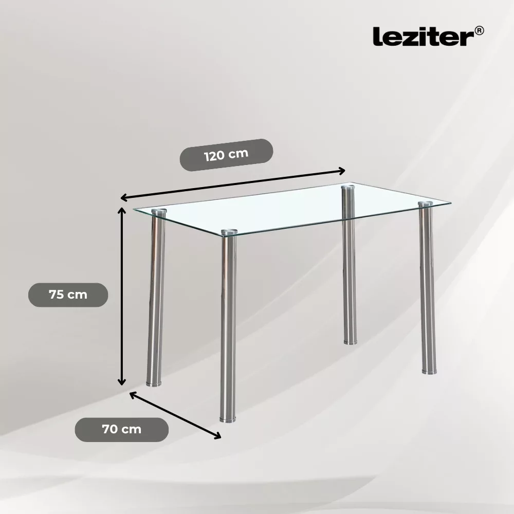 A Nolen étkezőgarnitúra középpontjában a Leziter Berna 120 cm-es üveg étkezőasztal áll, amely időtálló megoldást kínál a modern otthonok számára. Az asztallap 8 mm vastag, edzett és hőkezelt üvegből készült, amely nemcsak látványos, hanem kifejezetten strapabíró is. Ellenáll a karcolásoknak, könnyen tisztítható, és hosszú távon is megőrzi letisztult megjelenését.