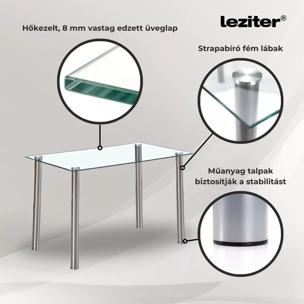 • Asztallap: 8 mm vastag, hőkezelt, edzett üveg