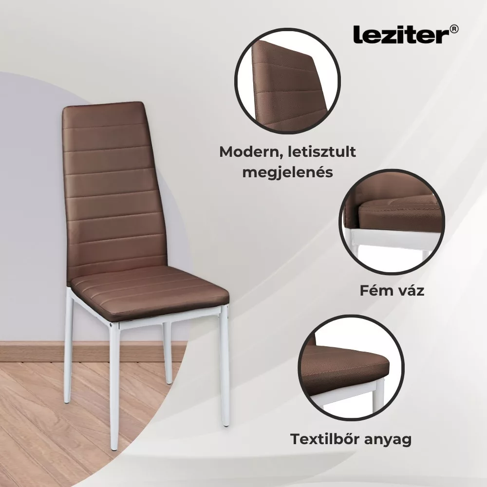 A Nolen garnitúrához tartozó Tino NOVA étkezőszékek modern barna színükkel erőteljes és letisztult megjelenést kölcsönöznek a térnek. A barna textilbőr ülőfelület nemcsak látványos, hanem kényelmes és könnyen tisztítható is. A fehér porfestett fém váz biztosítja a stabilitást és az időtállóságot.