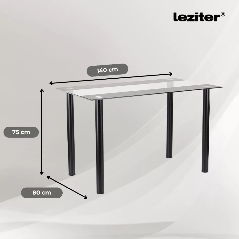 Az edzett üveg asztallap 8 mm vastagságú, ellenálló a karcolásokkal és hőhatásokkal szemben, miközben egy mozdulattal tisztítható. Mérete – 140 x 80 x 75 cm – lehetővé teszi, hogy 4-6 személy kényelmesen helyet foglaljon körülötte.