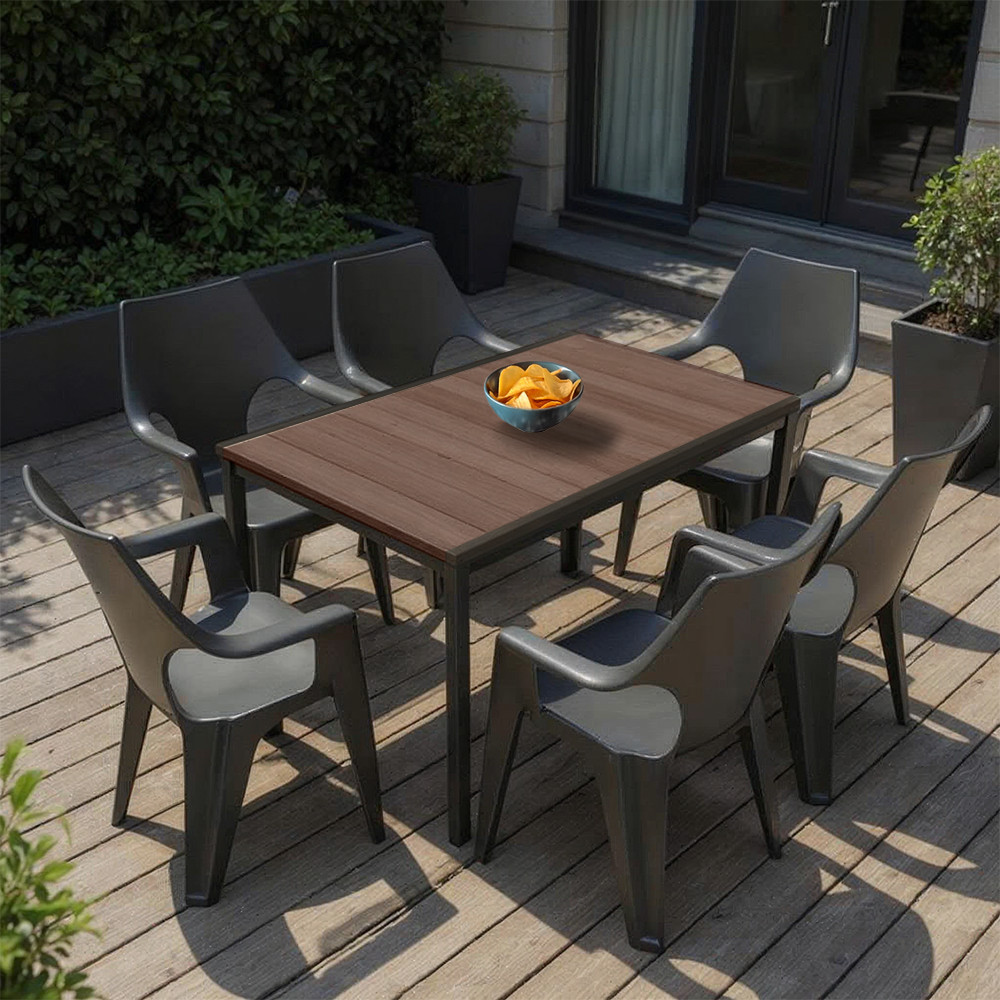 A Parker 6+1 kerti bútor garnitúra tökéletes választás, ha szeretnéd, hogy a kültéri étkezés ugyanolyan kényelmes legyen, mint bent a lakásban. A dió színű, fa hatású asztallap meleg hangulatot visz a kertedbe vagy a teraszodra, míg a grafitszürke székek stílusos, modern kontrasztot alkotnak vele. Egy ilyen szett nem csupán funkcionális – harmonikus központi eleme lehet bármely kültéri térnek.