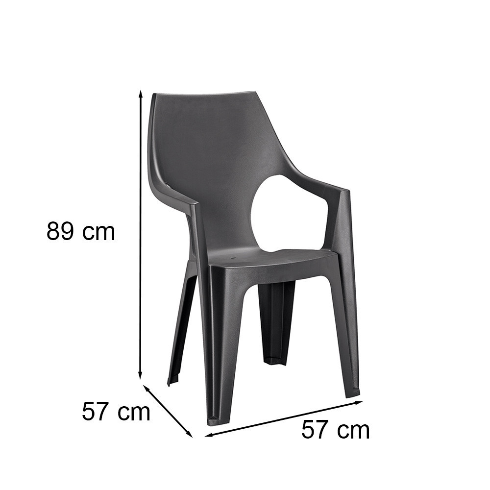 A székek tartós, színtartó műanyagból készültek, magas támlával és ergonomikus kialakítással. Az enyhén lekerekített háttámla és kartámaszok hosszabb ülések alatt is kényelmet biztosítanak, míg a rakatolható kialakítás helytakarékossá teszi a tárolást.