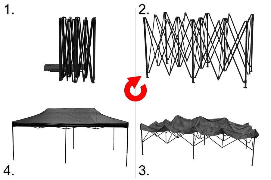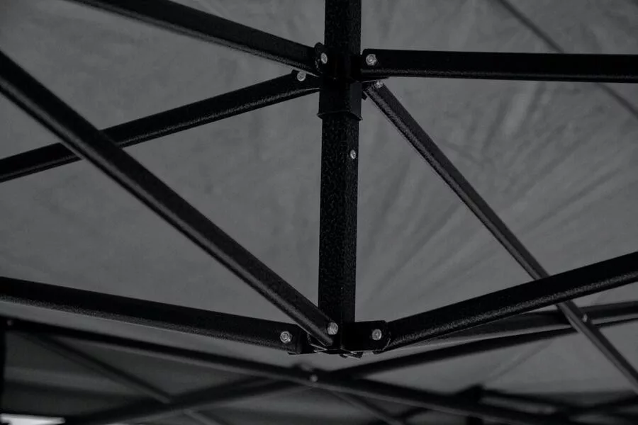 A sátor erős acél szerkezettel készült, amely gyors és egyszerű összeállítást tesz lehetővé. A sátor lábai rugós rögzítőmechanizmussal vannak ellátva, amely biztosítja a stabil és biztonságos magasságállítást.