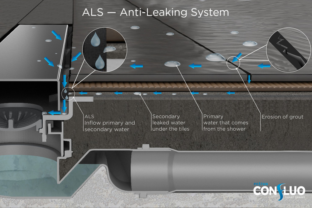 *ALS rendszer a Frameless Line, Slim Line és a Wall Drain modellek speciális tulajdonsága amely lehetővé teszi, hogy a csempék alól szivárgó vagy kondenzációs víz a lefolyóba kerüljön.