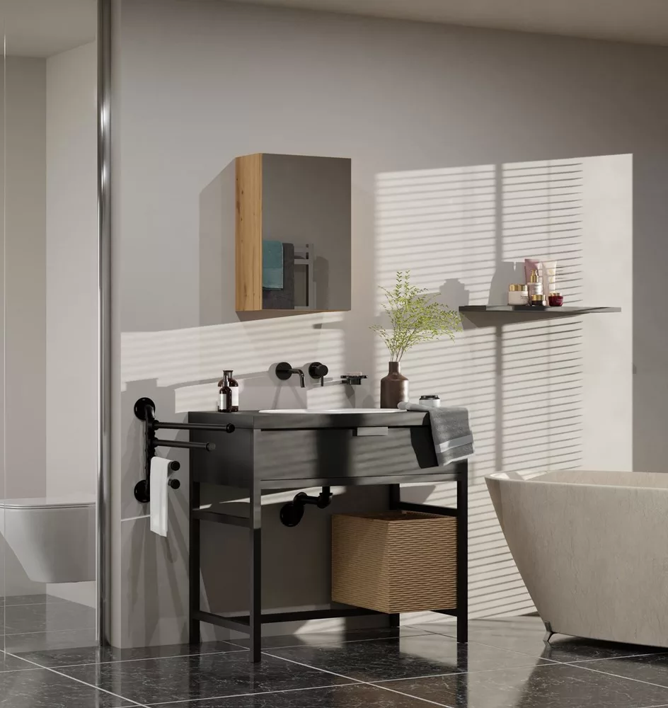 Az univerzális megjelenés megfelel mindenki elvárásainak, akik az egyszerűség és az elegancia kombinációját értékelik. A praktikus szekrény helyet biztosít a mosógépnek és egyéb dolgaidnak, valamint hangsúlyozza a modern, minimalista dizájnt.
