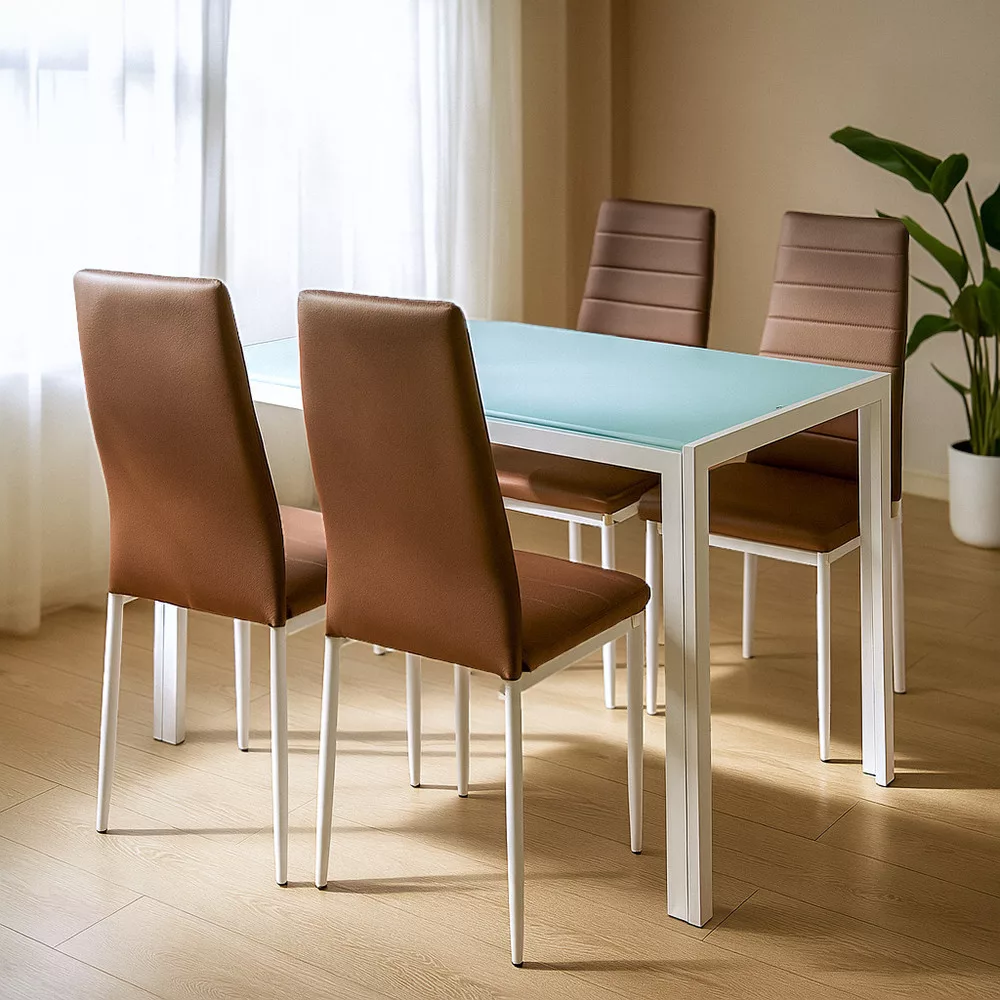 Portland 4+1 étkező garnitúra – Modern stílus barna székekkel és edzett üvegasztallal