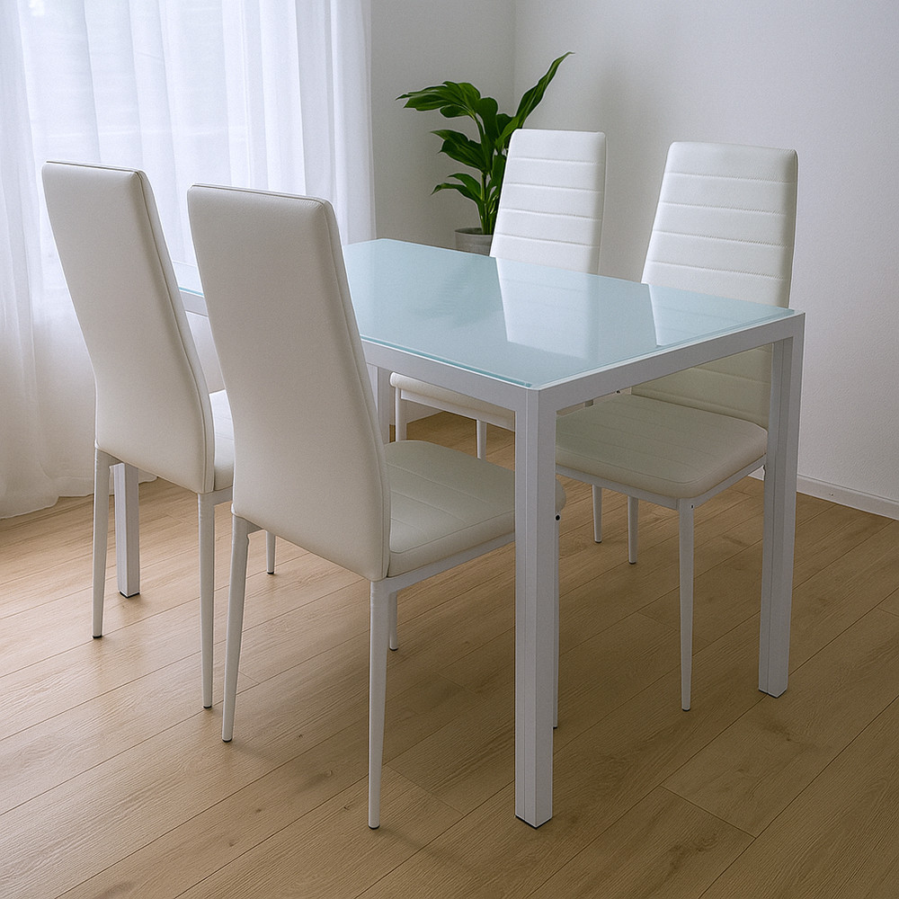Portland 4+1 étkező garnitúra – Modern stílus fehér székekkel és edzett üvegasztallal