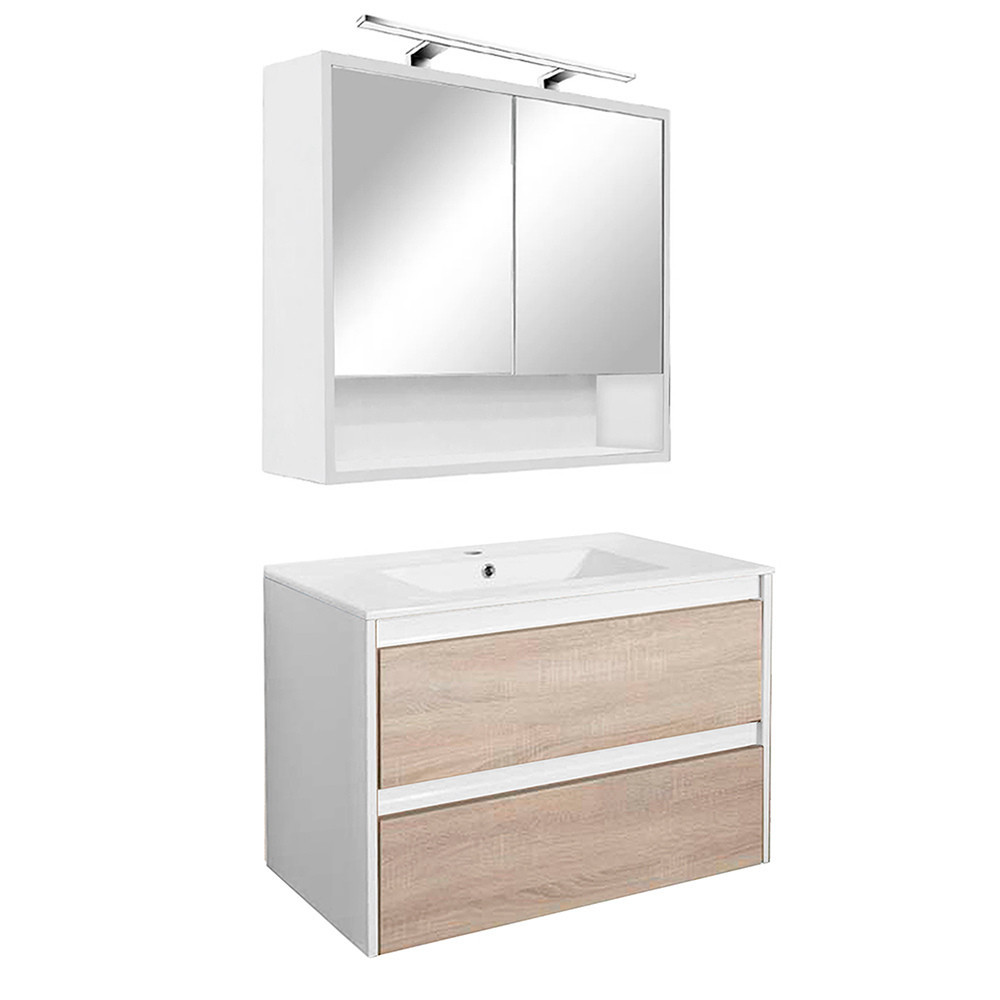A csomag része a bútorra tökéletesen illeszkedő,fehér színű, mélymedencés kerámia mosdóis, amely egy csaptelep számára kialakított hellyel rendelkezik. így nem kell külön keresni hozzá megfelelő mosdót. A csomag nem tartalmazza a lámpát, a csaptelepet és a leeresztőt!