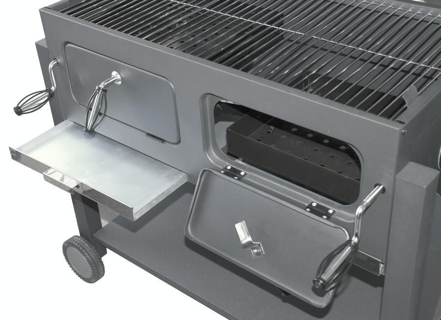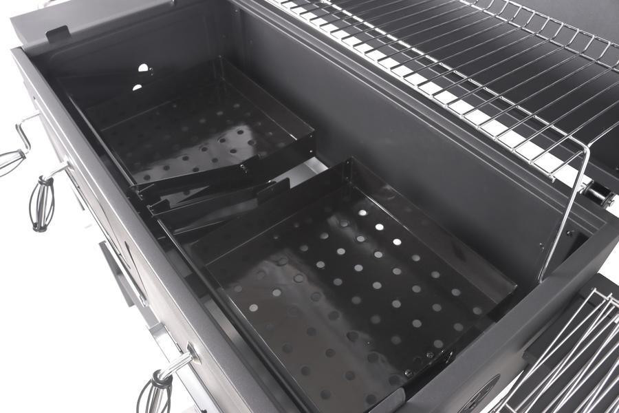 A grill további előnye a két külön állítható magasságú faszén tartó rács. így a grillezési hőfok az előlapon található mechanizmusokkal szabályozható, a sütnivaló és a faszén izzásának figyelembevételes szerint.