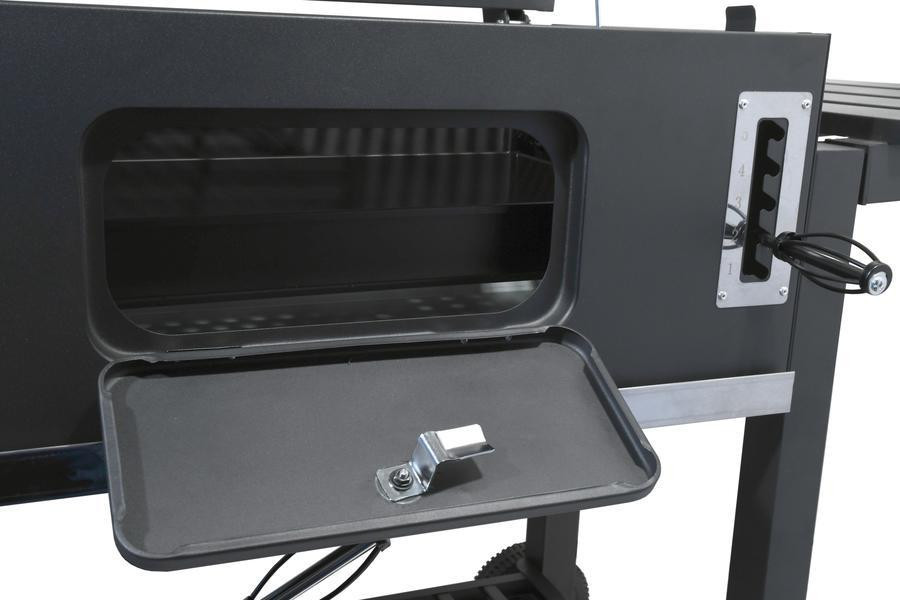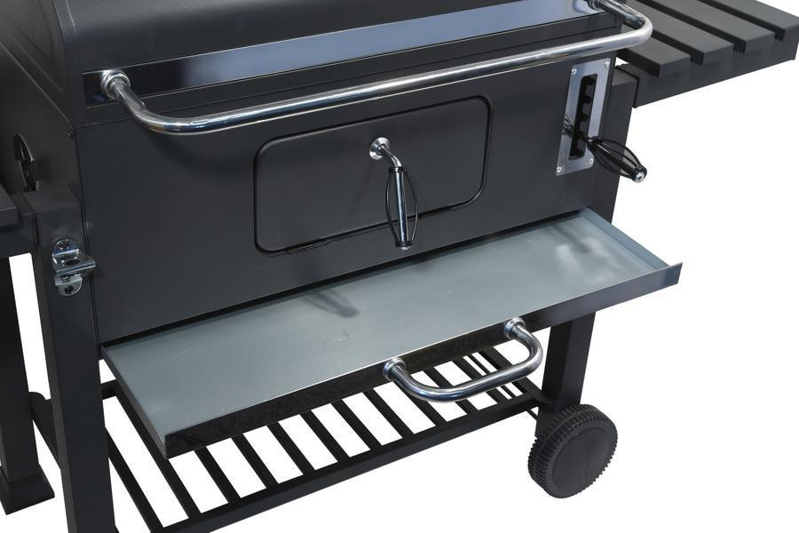 A grill további előnye az állítható magasságú faszén grill, így a grillezési tér az előlapon található mechanikával szabályozható, az edények igényei szerint. A grill elején található ajtó jelentősen megkönnyíti a szén utántöltését. A grillező alján egy hamutartó fiók található a könnyű tisztítás érdekében.