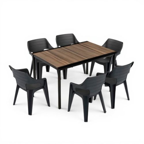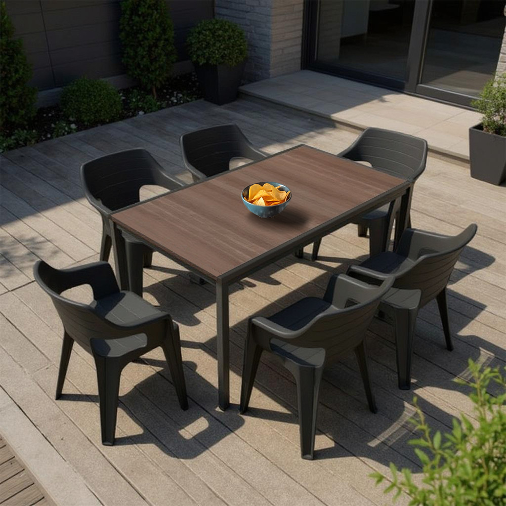 A Ravello 6+1 kerti bútor garnitúra dió-fekete színkombinációjával ideális választás azok számára, akik kompakt, de stílusos kültéri bútorokat keresnek. A Porto 160 műanyag kerti asztal DecoCoat™ technológiával készült, fa hatású műanyag felülettel rendelkezik, amely nemcsak természetes szépséget, hanem időjárásállóságot is garantál. A stabil, fekete színű fémváz biztosítja a garnitúra hosszú élettartamát és megbízhatóságát.