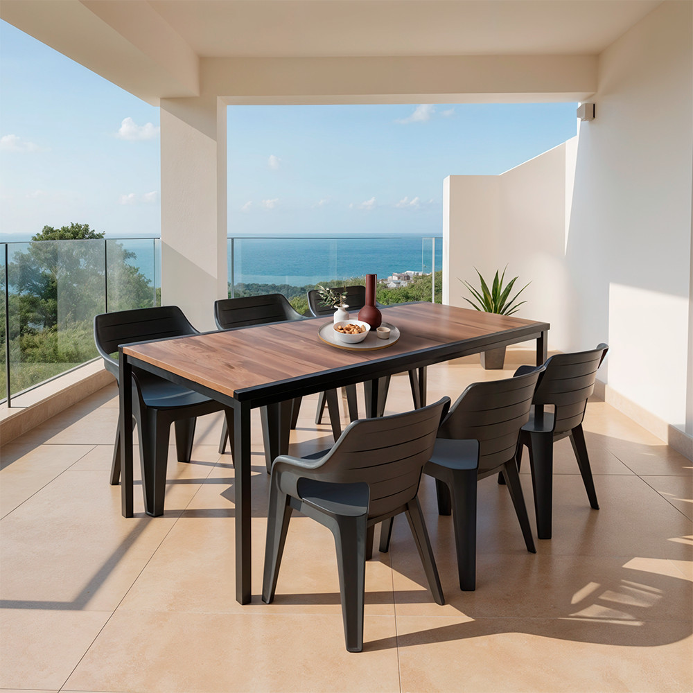 Egyetlen, nagyméretű szettben kapsz meg mindent, ami a vasárnapi, ráérős reggelitől a baráti grillpartiig kell: hat Bilbao Lowback kartámaszos szék vízelvezető nyílással + egy 200 × 95 cm-es Porto étkezőasztal – prémium műanyagból, kompromisszumok nélküli kényelemmel és nulla karbantartással.