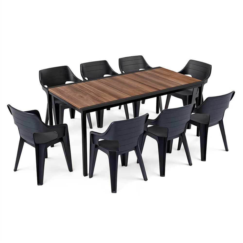 Keter Ravello Large 8 + 1 kerti garnitúra – dió asztallap & fekete rakásolható székek