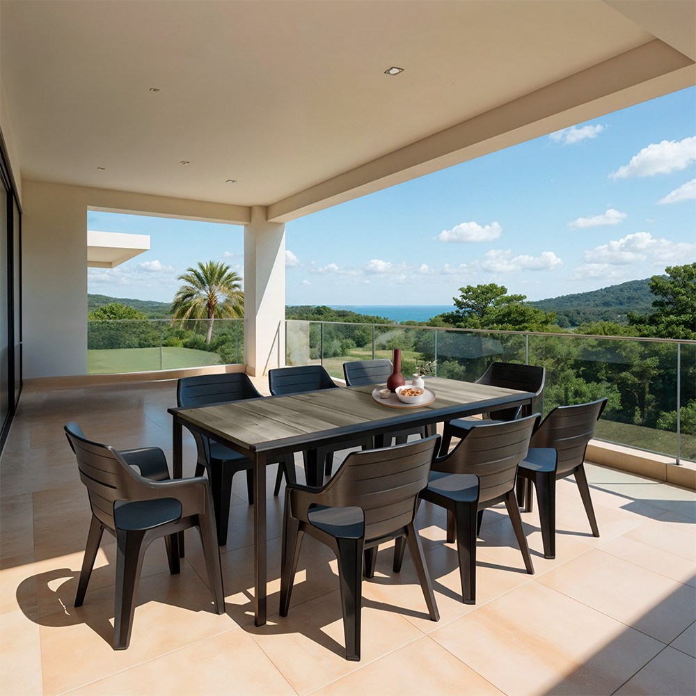 Egyetlen, nagyméretű szettben kapsz meg mindent, ami a vasárnapi, ráérős reggelitől a baráti grillpartiig kell: hat Bilbao Lowback kartámaszos szék vízelvezető nyílással + egy 200 × 95 cm-es Porto étkezőasztal – prémium műanyagból, kompromisszumok nélküli kényelemmel és nulla karbantartással.