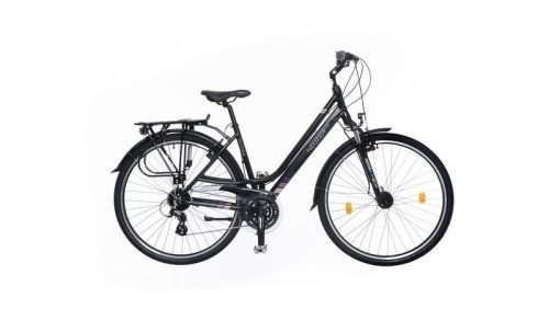 Nőknek ajánlott trekking kerékpár városi közlekedéshez és hétköznapi használatra kényelmes testtartással.