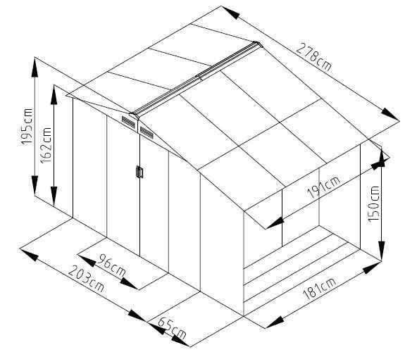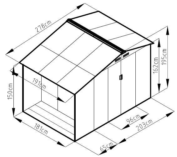 Az LUKE A2 fém kerti ház méretei 278 x 191 x 195 cm, ami elegendő helyet biztosít a kerti eszközök és felszerelések tárolásához. Szürke színének modern megjelenése van, így tökéletesen illik bármilyen kert stílusához és környezetéhez.