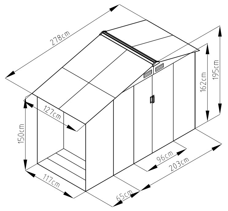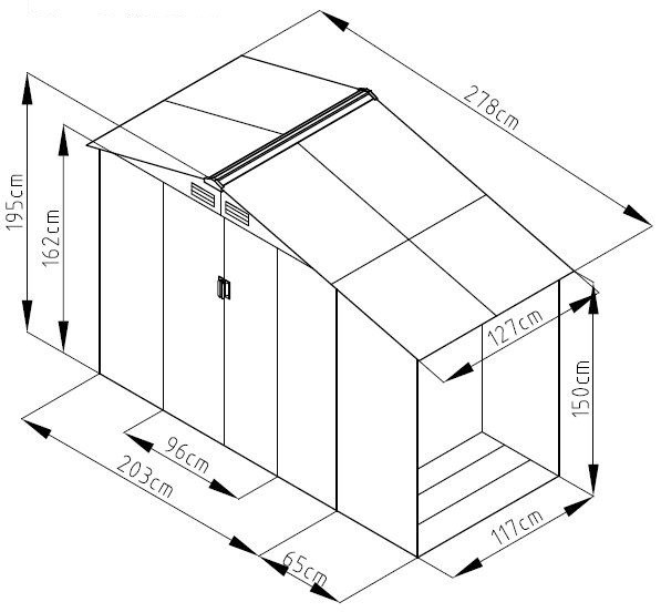 Kialakítás és Méretek: A ROJAPLAST LUKE A fém kerti ház kiválóan alkalmas a mindennapos használatra. Méretei 278 x 127 x 195 cm, így elegendő tárolóhelyet biztosít minden kerti szükségletéhez. Az oldaltetővel rendelkező fém szerkezet tökéletes védelmet nyújt a szélsőséges időjárási viszontagságokkal szemben, így eszközei biztonságban lesznek.