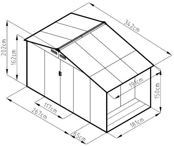 A kerti ház kiváló minőségű anyagokból készült, 0,25-0,30 mm vastag acéllemezekből és 0,5-0,8 mm vastag, kiváló minőségű horganyzott acél keretből. Az acél, horganyzott szerkezet biztosítja a tartósságot és a hosszú élettartamot. Emellett szellőzőrácsokkal is ellátva van, hogy megakadályozza a páralecsapódást és a kondenzációt a házban.