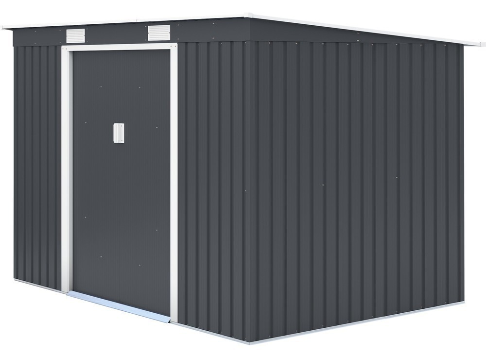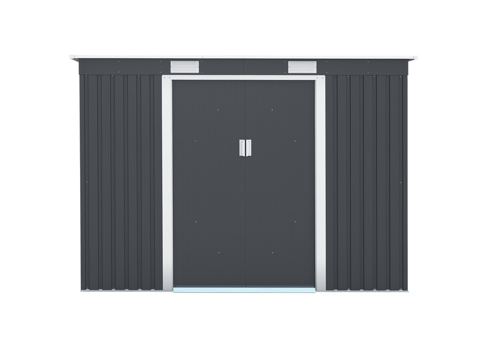 A sötétszürke szín és a letisztult vonalvezetés modern megjelenést kölcsönöz, amely harmonikusan illeszkedik bármilyen kertkörnyezetbe. A dupla tolóajtó könnyű hozzáférést biztosít, és helytakarékosan nyitható, így a kisebb kertekben is előnyös megoldás.