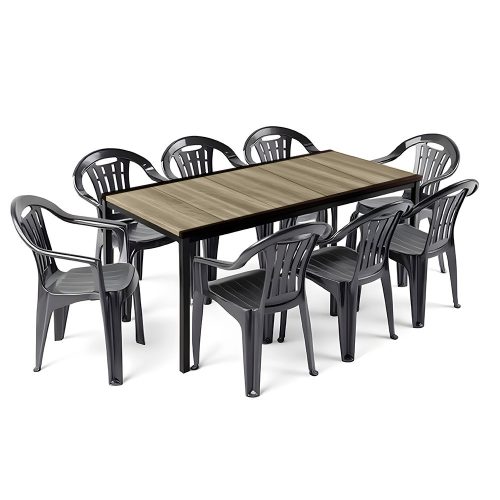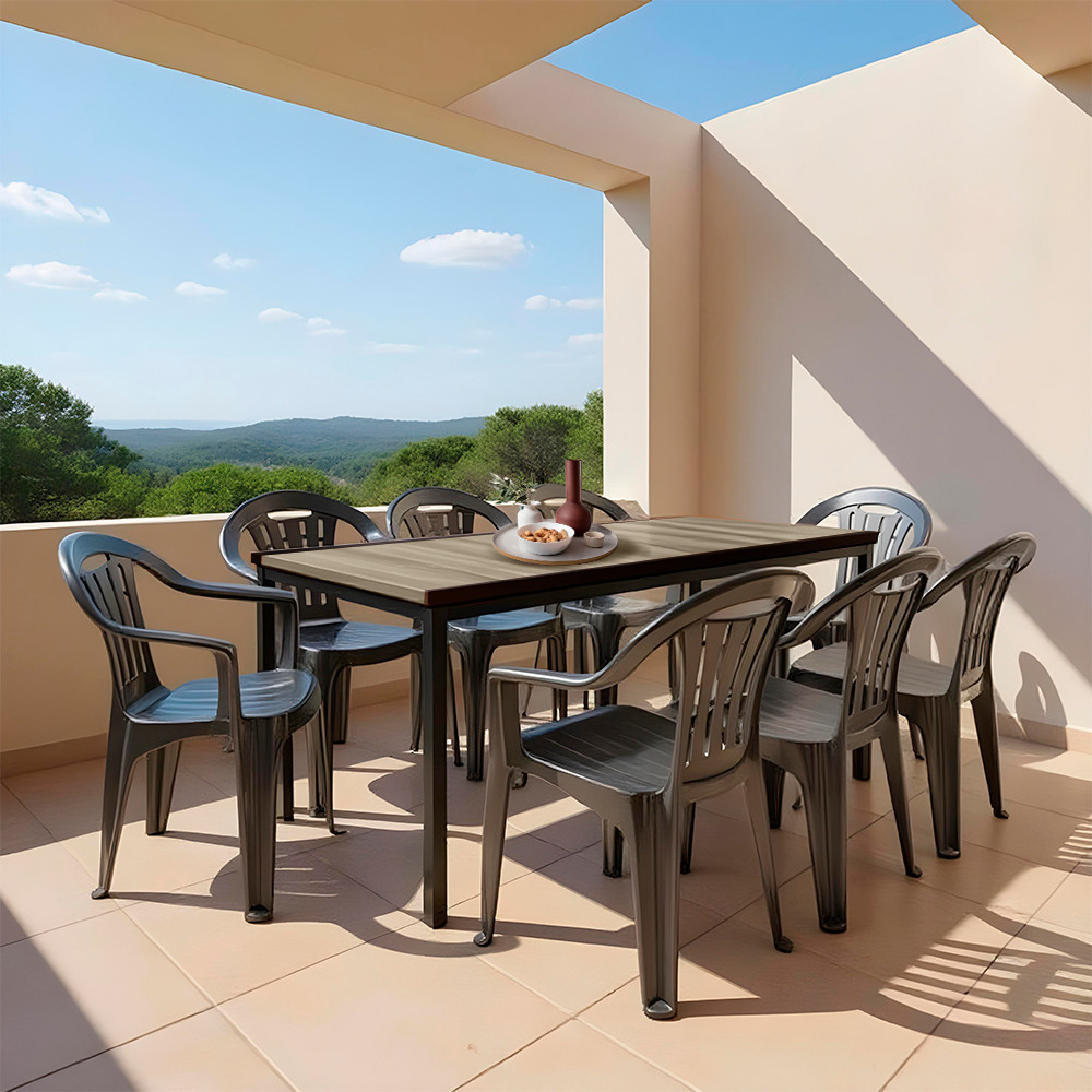 A Mallorca székek és a Porto 200 asztal ellenáll az átlagos időjárási viszonyoknak, UV-álló fröccsöntött polipropilénből készültek, amely nem repedezik, nem rozsdásodik és nem fakul. A Porto asztallap különleges DecoCoat™ fa hatású felülete valódi erezetet idéz, mégis karc-, víz- és időjárásálló. A fekete acélváz stabil tartást biztosít, rozsdásodás nélkül.