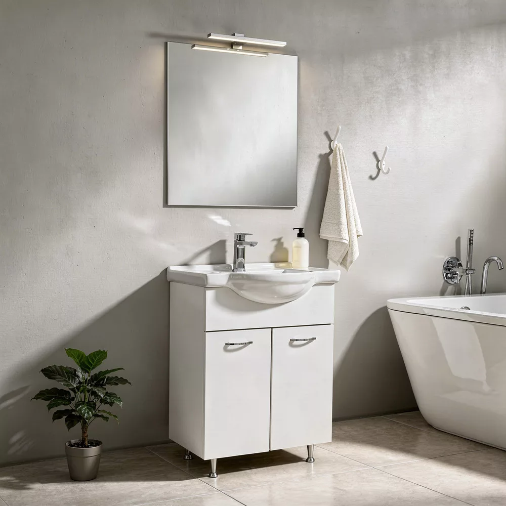 A fehér bútorlapból készült test krómozott fogantyúkkal párosul, a kerámia mosdó íves kialakítása pedig eleganciát kölcsönöz a bútornak. A minimalista CUBE tükör (65 × 80 cm) keret nélkül, világítás nélkül érkezik – szabadon kombinálható bármilyen fali lámpával.