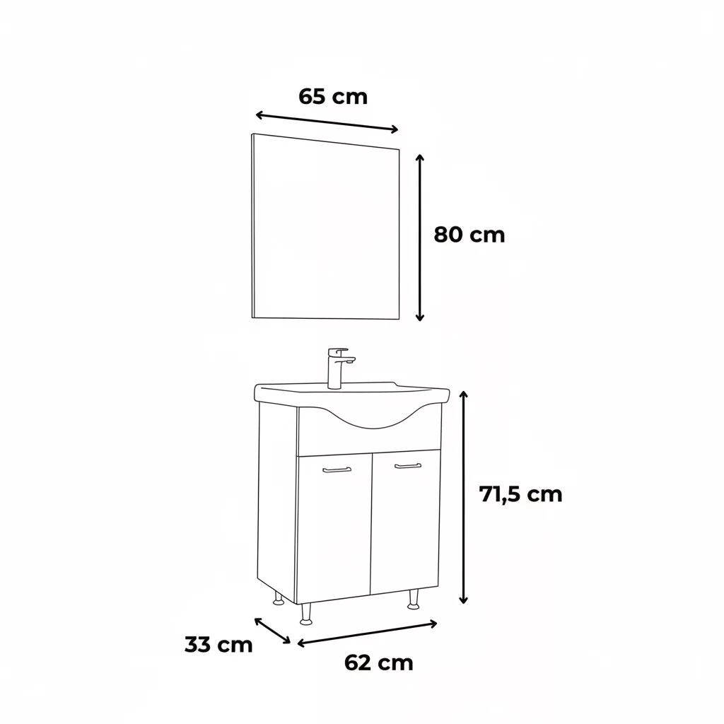 A bútor mindössze 62 cm széles, mégis elegendő tárolóhelyet kínál a fürdőszobai kellékek számára. Álló kivitelű alsószekrénye belül polcos elrendezésű, ajtóval zárható, így segít rendet tartani a mindennapokban.