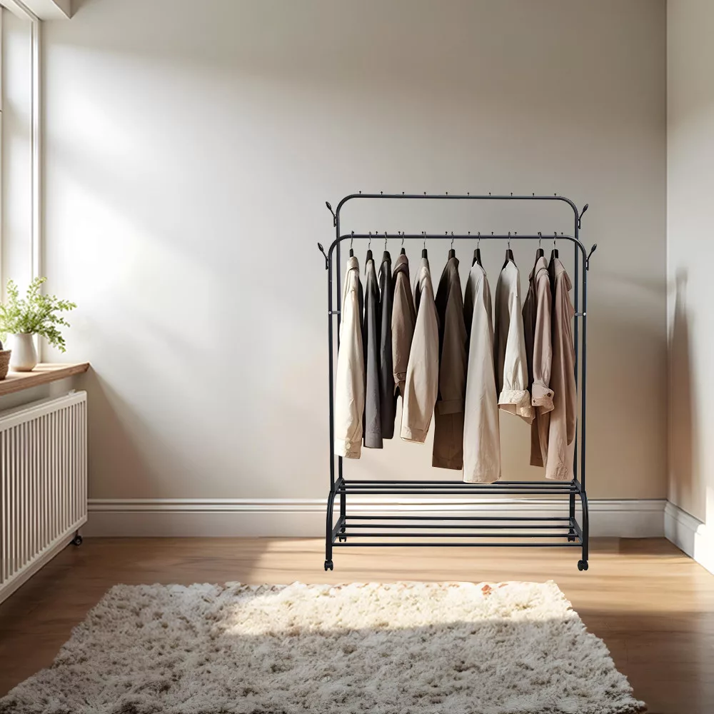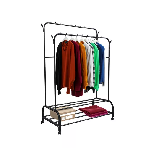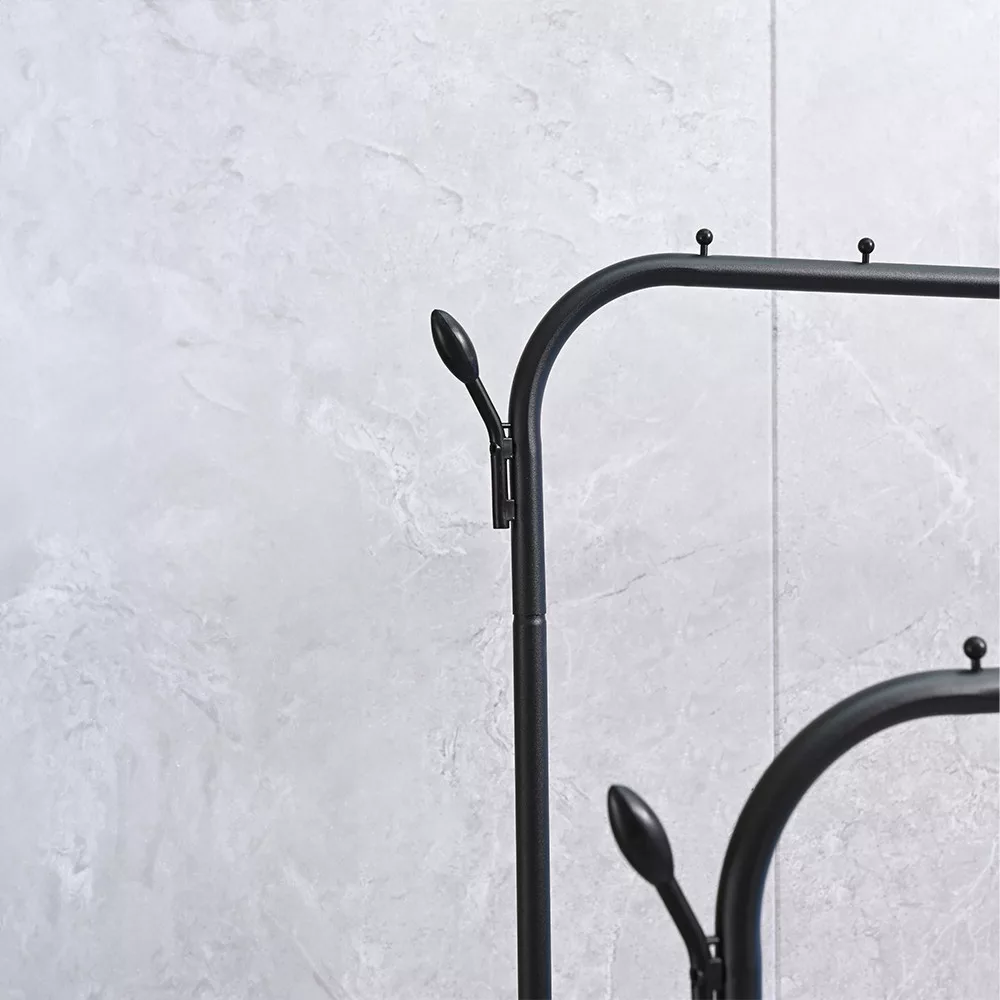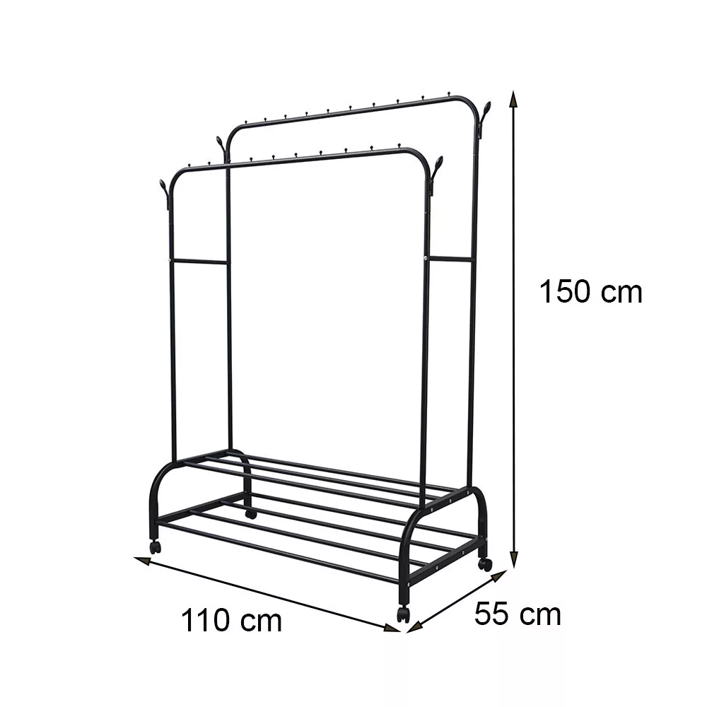 • Felépítés: Két vízszintes rúddal felszerelt, így dupla tárolóhelyet kínál a ruhák számára. Ideális kabátok, dzsekik, ruhák és egyéb ruhatári tárgyak felakasztásához.