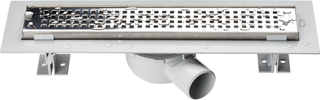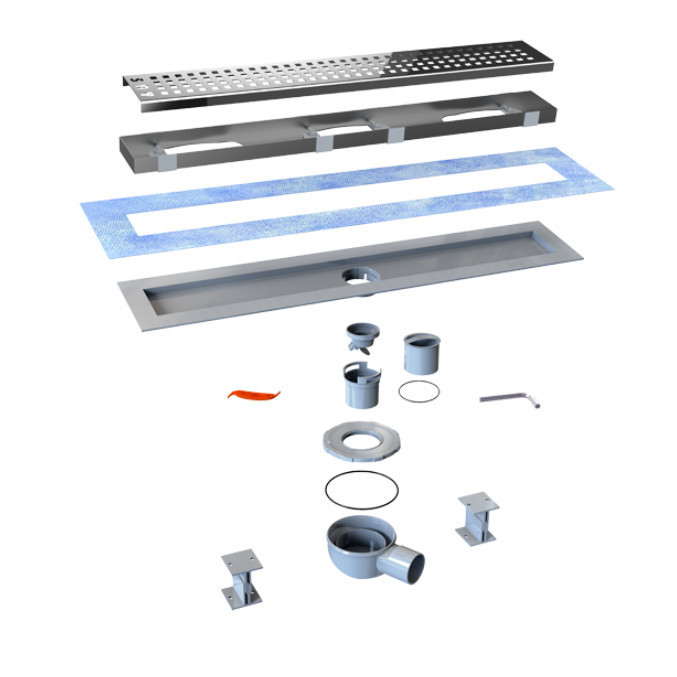 A rács és a keret 1,5 mm-es AISI 304 rozsdamentes acélból, a lefolyótest pedig ABS műanyagból készül. A monolit szigetelőlemeznek köszönhetően a szigetelőszalag felhordása praktikusabb. Ezzel a technikával a zuhanyfolyóka körüli illesztésekben előforduló hibák megelőzhetők, és a víz a zuhanyfolyókában marad. 360 fokban forgatható szifon, amely könnyen csatlakoztatható csövekhez. Könnyű beszerelés az állítható magasságú lábakkal.