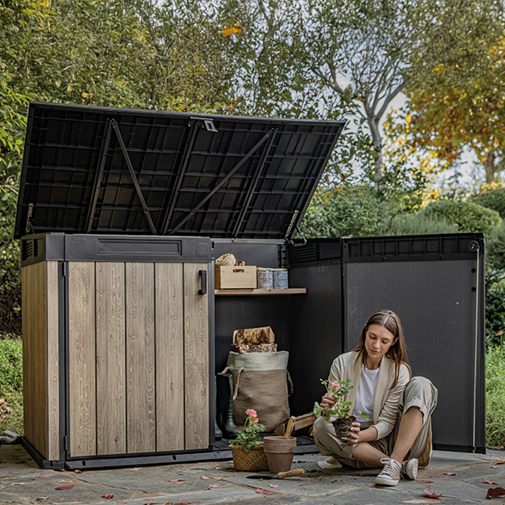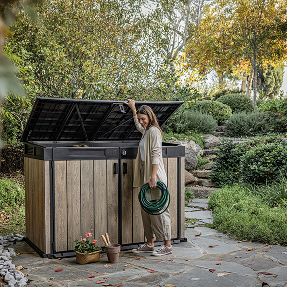 A DecoCoat™ technológia garantálja, hogy a tároló nem rozsdásodik, nem repedezik, és UV-álló felülettel rendelkezik. Az erős hidraulikus nyitószerkezet és fém zsanérok biztosítják a könnyed használatot és a hosszú élettartamot.