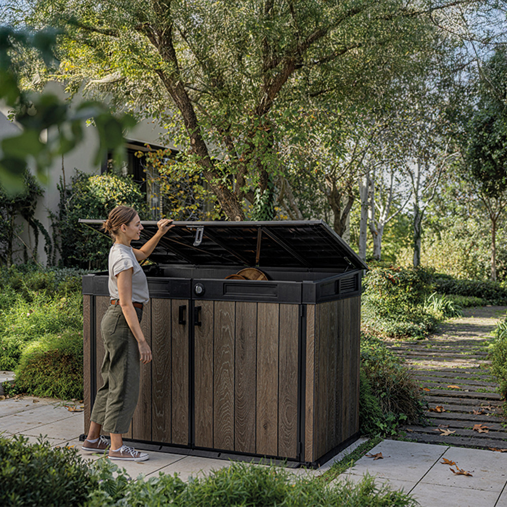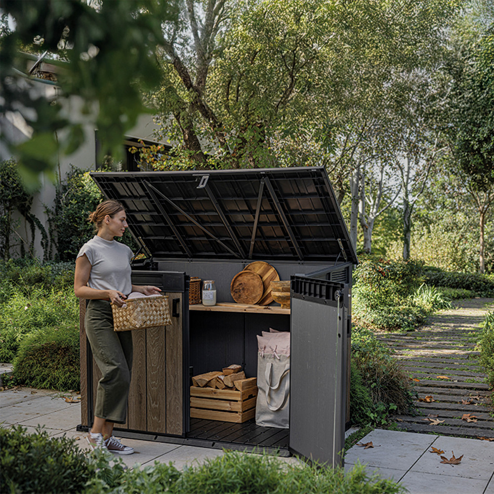 A DecoCoat™ technológia garantálja, hogy a tároló nem rozsdásodik, nem repedezik, és UV-álló felülettel rendelkezik. Az erős hidraulikus nyitószerkezet és fém zsanérok biztosítják a könnyed használatot és a hosszú élettartamot.