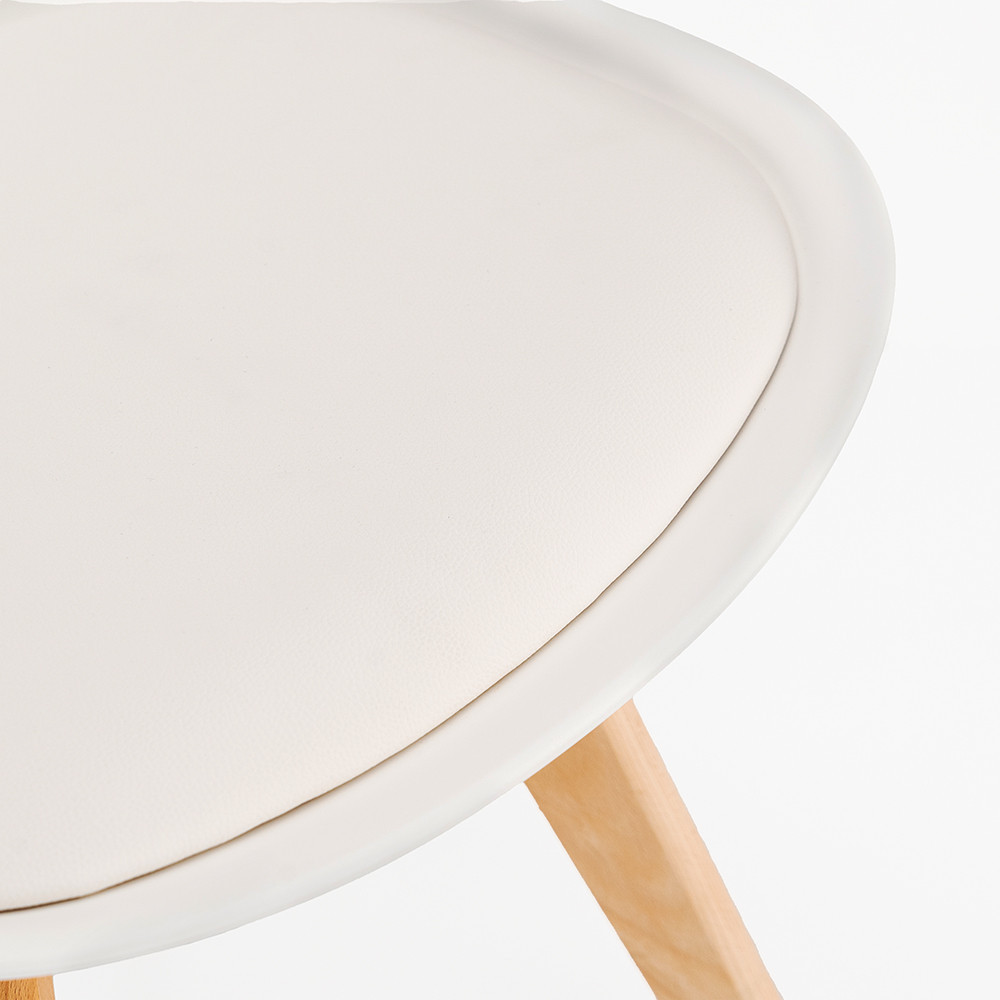 Az ülőfelület strapabíró polipropilénből készült, amely egyszerre tartós és könnyen tisztítható – ideális választás mindennapos használatra. A szintetikus bőrhatású PVC párnázat extra kényelmet nyújt, miközben egyszerűen letörölhető, így családok számára is praktikus megoldás. A bükk színű, erős fa lábak biztosítják a stabilitást és a hosszú élettartamot.