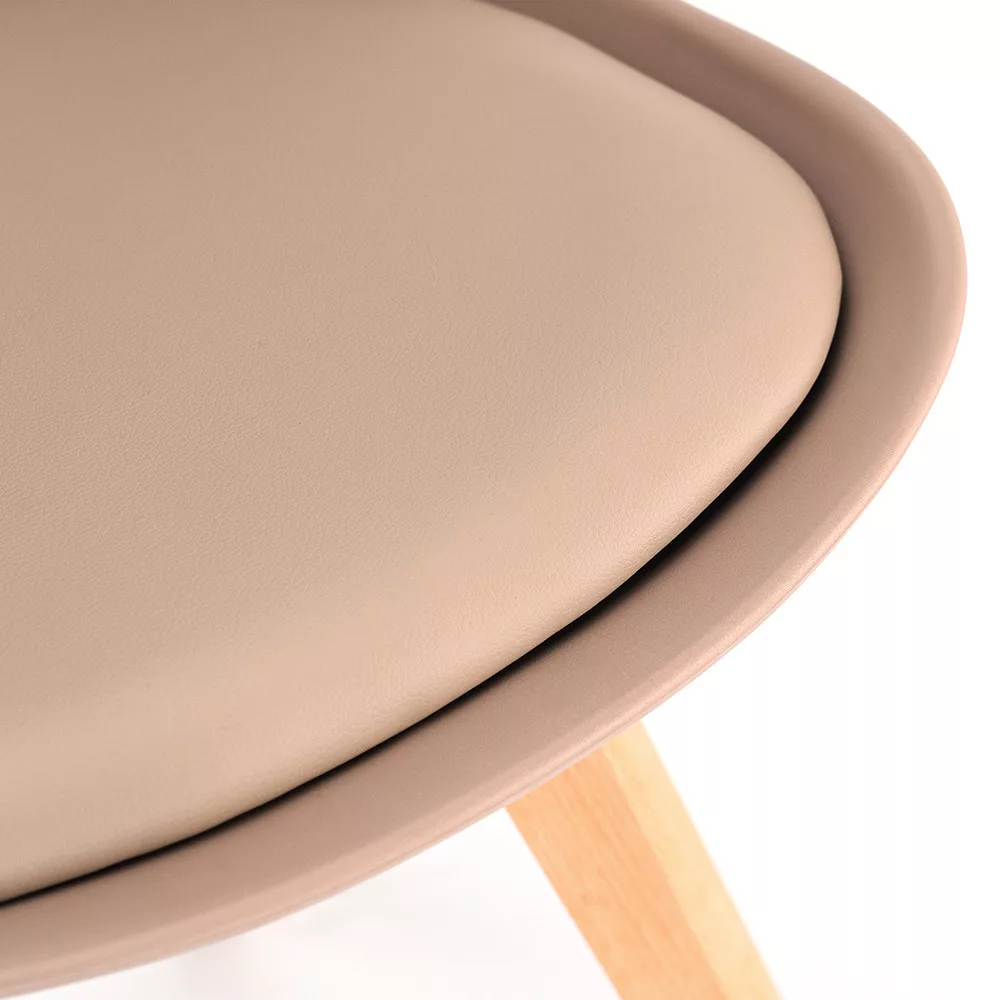 Az ülőfelület strapabíró polipropilénből készült, amely egyszerre tartós és könnyen tisztítható – ideális választás mindennapos használatra. A szintetikus bőrhatású PVC párnázat extra kényelmet nyújt, miközben egyszerűen letörölhető, így családok számára is praktikus megoldás. A bükk színű, erős fa lábak biztosítják a stabilitást és a hosszú élettartamot.