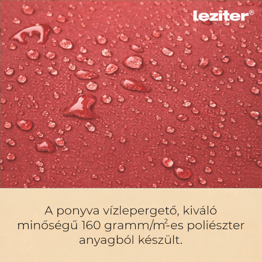 A Leziter Solari kerti napernyő 300 cm átmérőjű kialakítással rendelkezik, amely egyenletes lefedést biztosít a középoszlop körül. A kör alakú forma jól használható kertekben, teraszokon vagy kerti bútorok fölött. A ponyva kialakítása a mindennapi kültéri használathoz igazodik, felülete vízlepergető, így a nedvesség nem szívódik fel azonnal. A piros szín karakteres megjelenést ad, és jól illeszkedik különböző kerti környezetekhez.