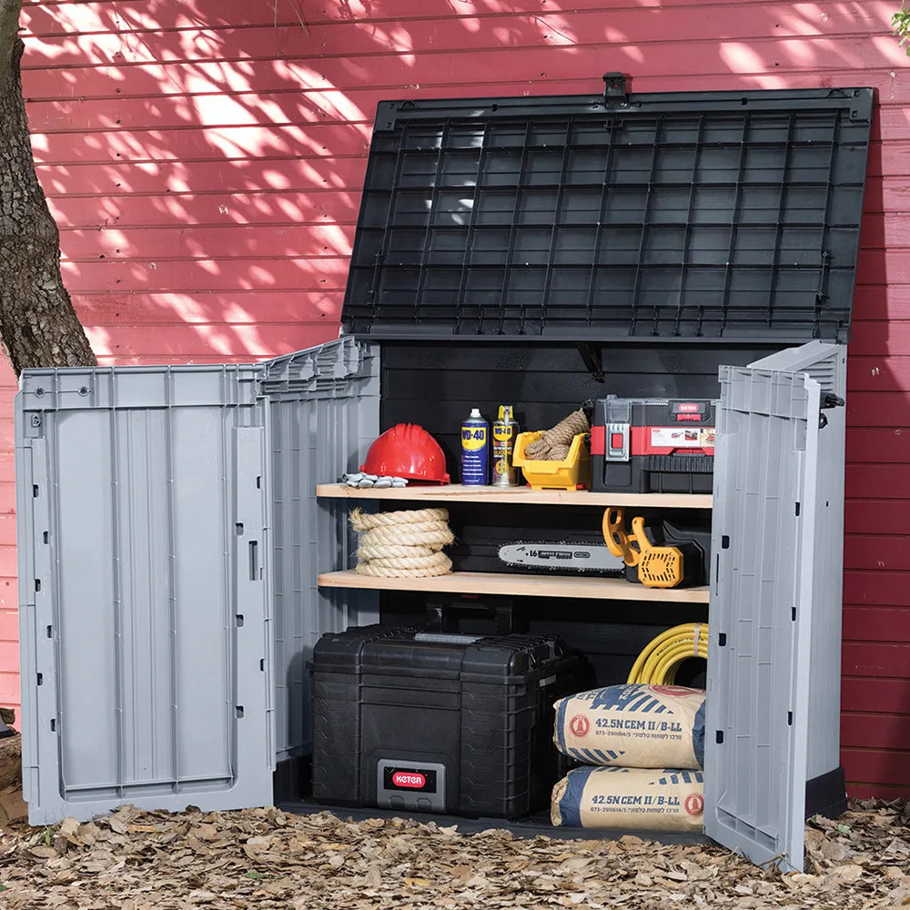 A műanyag kerti tároló sokféle céllal használható. Általában használatos a kerti szerszámok, a játékok, a grill, a hintaágyak, és más hasonló kerti kiegészítők tárolására. A tároló könnyen összeszerelhető, így gyorsan használatba vehető.