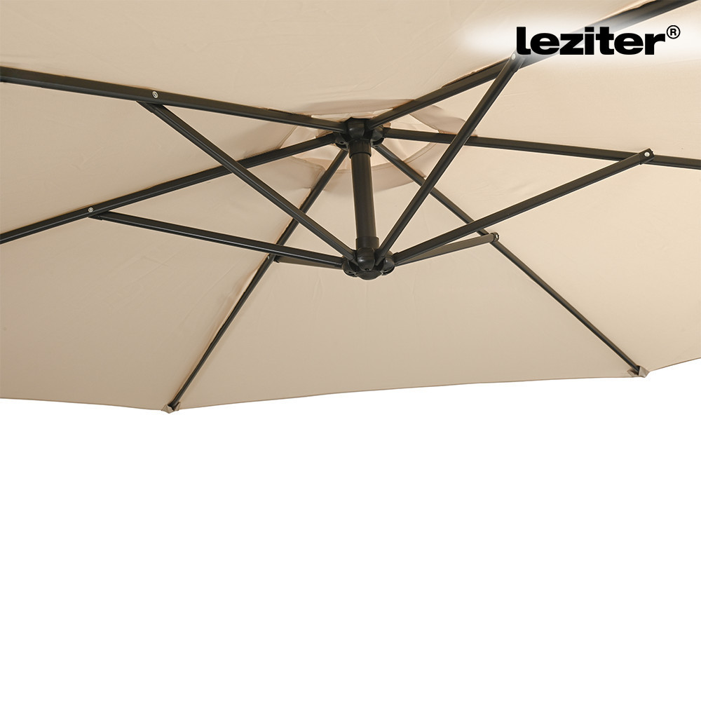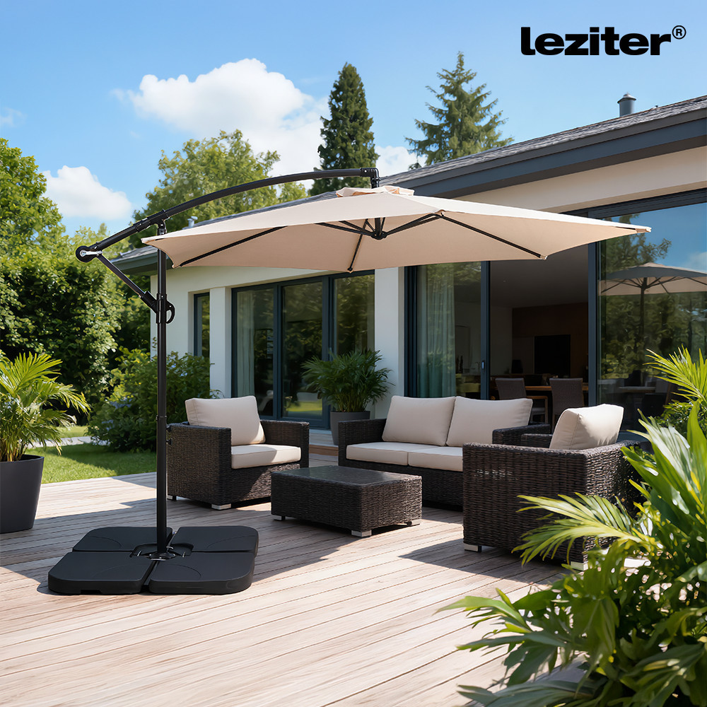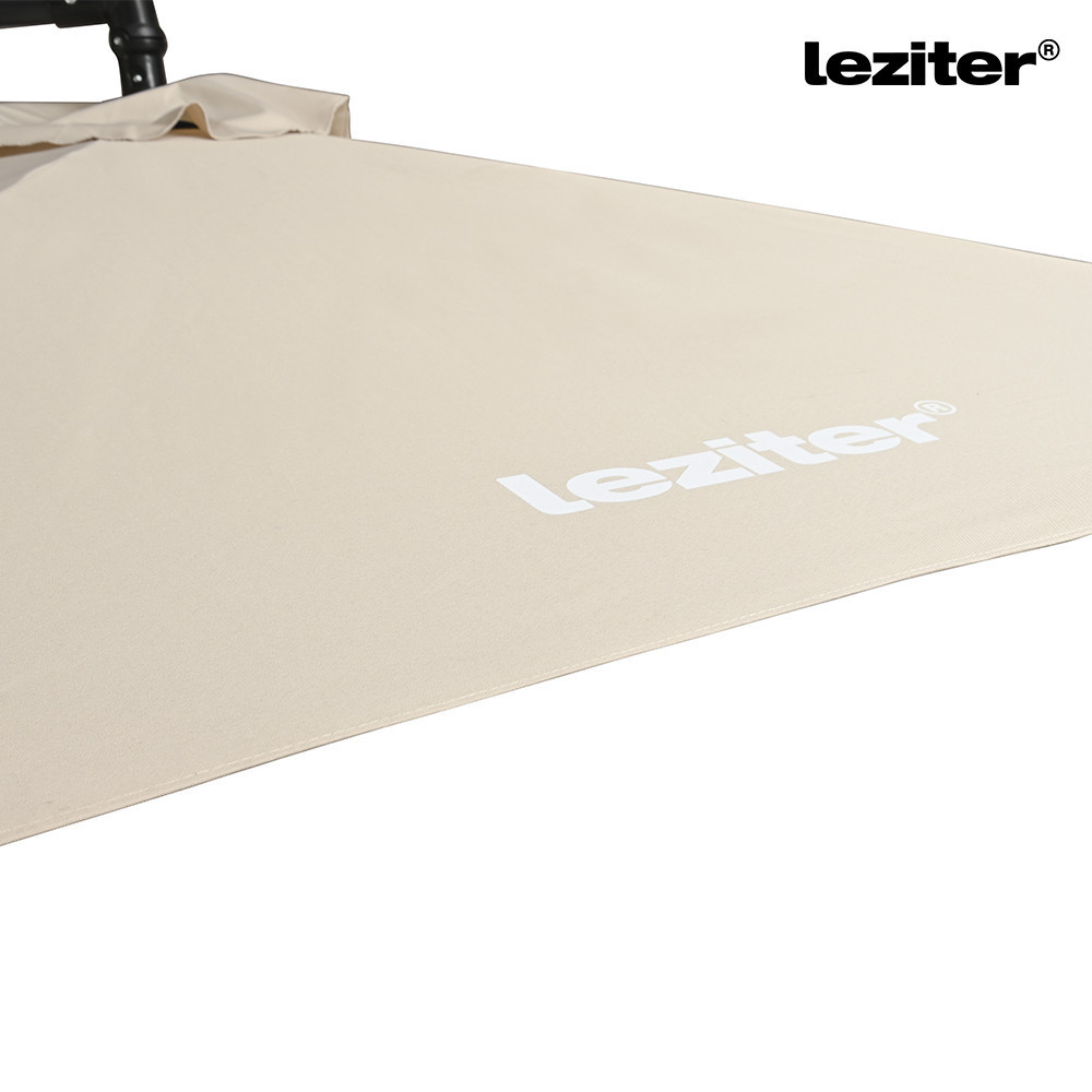 A Leziter Sunny kerti napernyő 300 cm átmérőjű kialakítással rendelkezik, amely egyenletes lefedést biztosít az árnyékolt területen. A kör alakú forma jól használható kertekben, teraszokon vagy kerti bútorok fölött. A ponyva kialakítása a mindennapi kültéri használathoz igazodik, felülete vízlepergető, így a nedvesség nem szívódik fel azonnal. A bézs szín világos, visszafogott megjelenést ad, amely könnyen illeszkedik különböző kültéri környezetekhez.