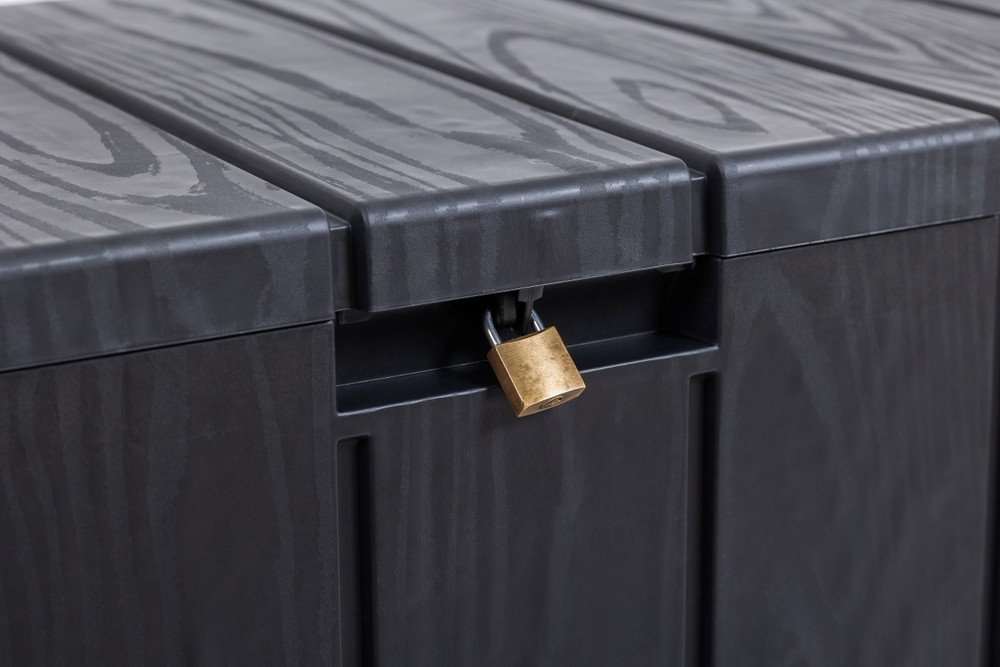 Ez a tárolódoboz egy kis eleganciát kölcsönöz kertjének. A fa felület utánzatának köszönhetően úgy néz ki, mint egy luxusbútor. A nyugalom kedvéért pedig le is zárhatja, hogy megvédje a tartalmát a hívatlan vendégektől.