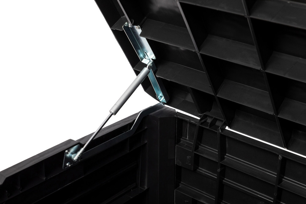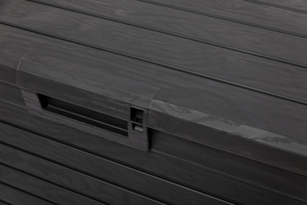 A doboz fedelének könnyű kinyitásához dugattyúk (gázrugók) vannak, amelyek segítenek a mindennapi használatban. Ráadásul a FLORIDA 550 l-es tárolódoboz fafelületet utánozva készült, amely nemcsak praktikus tárolóhelyet, hanem stílusos megjelenést is kölcsönöz kertjének.
