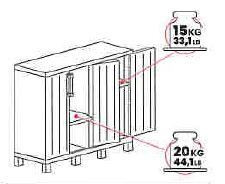 A szekrény két állítható polccal van felszerelve, az egyik (a szekrény szélesebb részében) 20 kg-ig, a másik (a szekrény szűkebb részében) 15 kg-os szerszámok és munkasegédek tárolására alkalmas, lehetőséget adva rugalmasan szervezze meg a belső teret az egyéni igényeknek megfelelően.